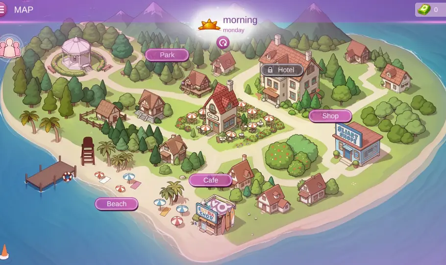 你需要管理时间、在不同地点之间移动、赚钱、玩小游戏,并与女性建立亲密关系!