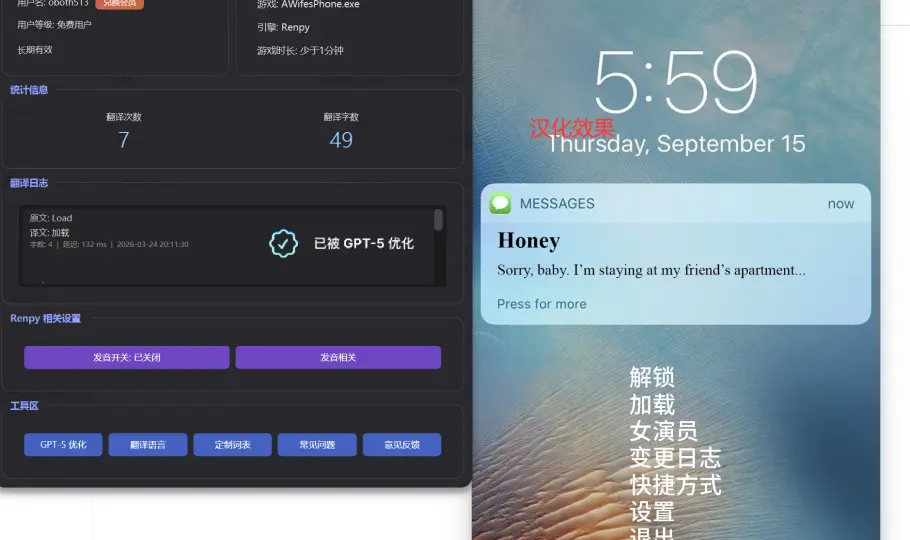 RenpyThief使用的是ChatGPT5的大模型优化引擎,翻译效果相当于精翻水平,已经有会员的兄弟直接用这个!